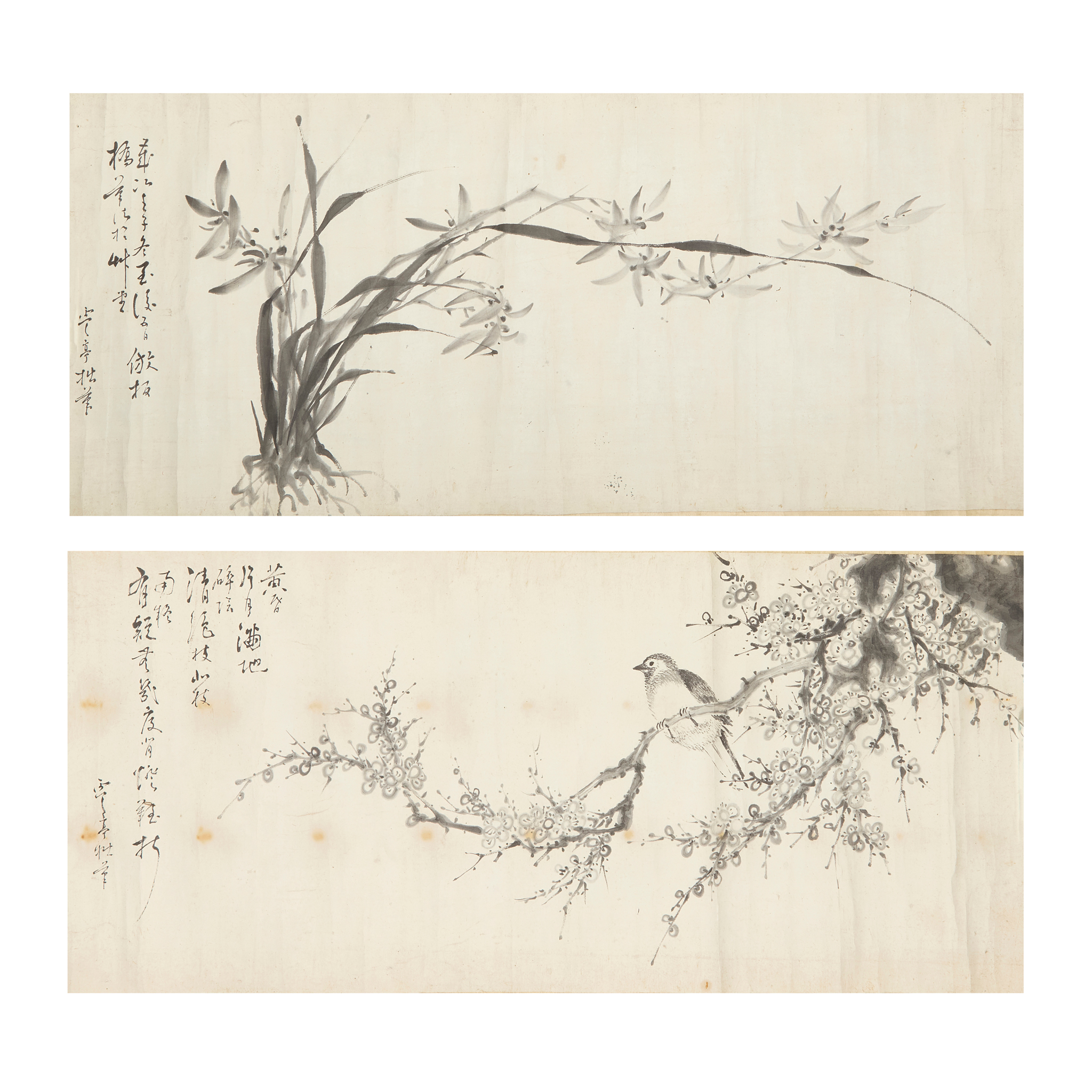 TWO CHINESE INK PAINTINGS OF BIRD ON BRANCH OF PLUM BLOSSOM AND ORCHIDS