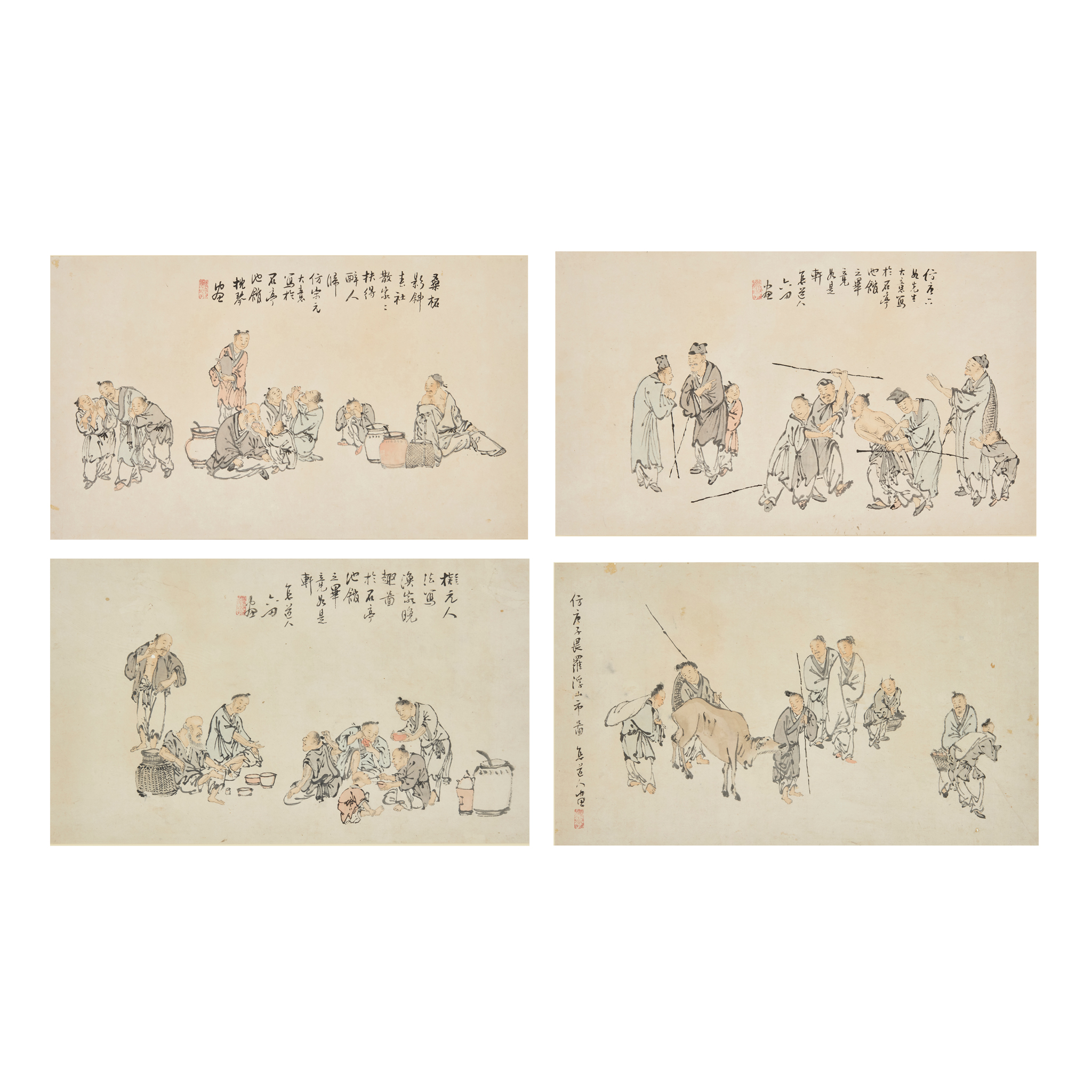 each depicting fishermen, seven blind men with two attendants, market day at Mount Luofu, and after the Spring Festival, all signed and with a seal of the artist, framed (4)