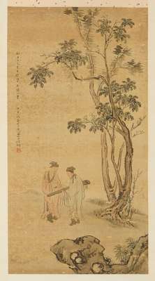 CHINESE INK PAINTING OF TWO FIGURES WITH A TRANSVERSE HARP