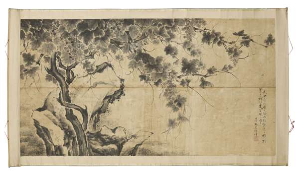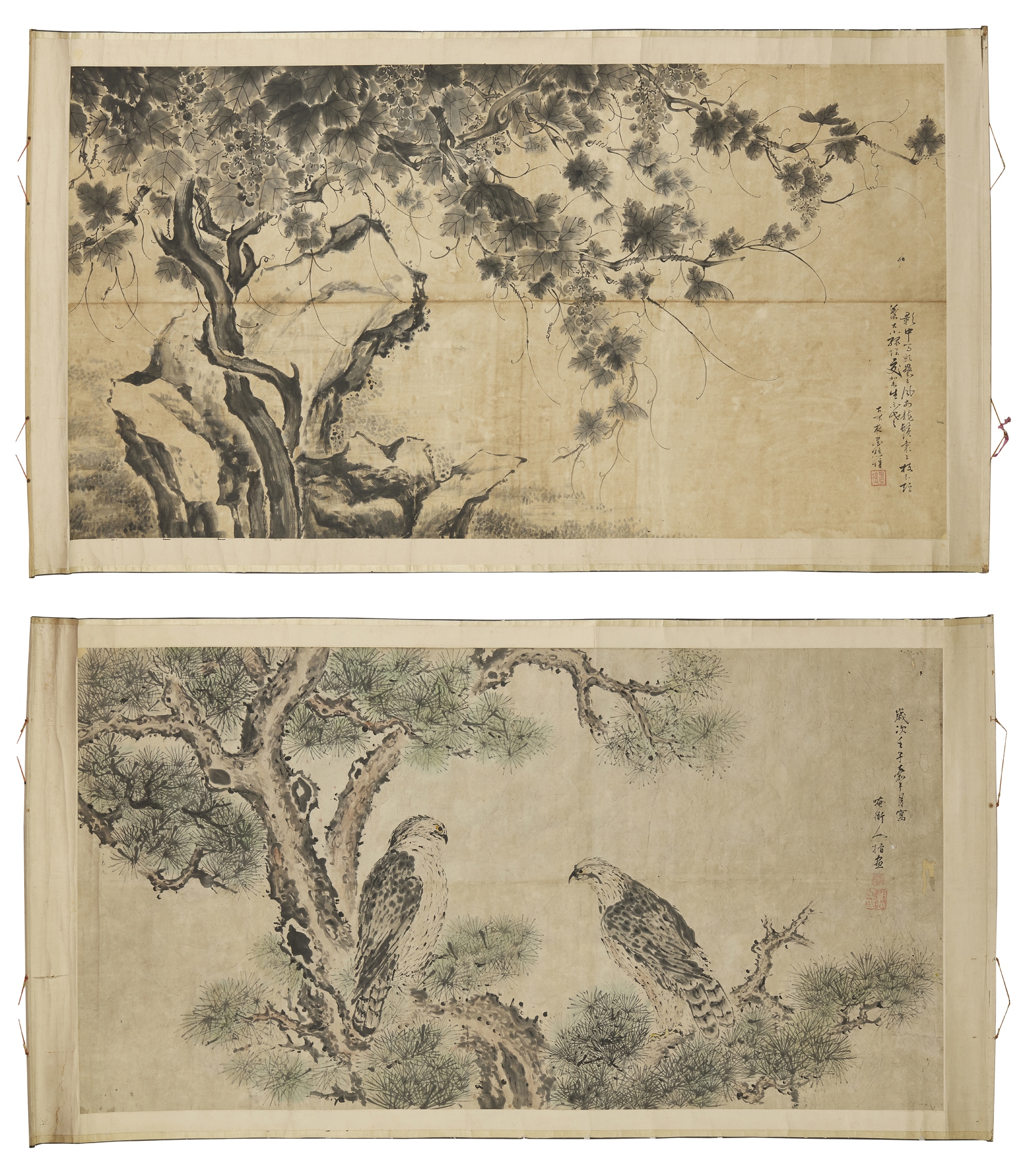 one ink and muted colours on paper, depicting pine and eagles, dated to the year of Ren Zi, corresponding to 1852AD, with inscriptions, signature and seals; and one ink on paper, depicting fruiting vine, with signature and seal, both large horizontal handscrolls (2)
