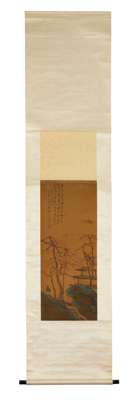 CHINESE INK PAINTING WITH SCHOLAR AND TEMPLE IN LANDSCAPE, DATED TO 1839