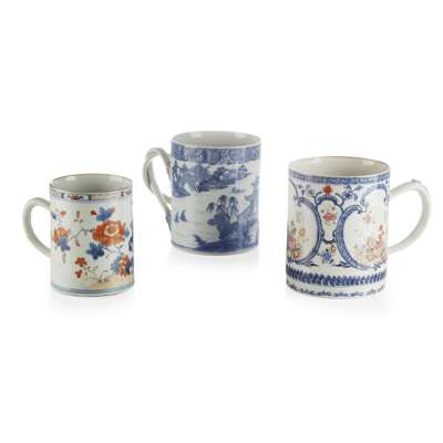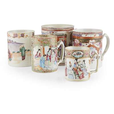 FIVE CHINESE EXPORT PORCELAIN TANKARDS