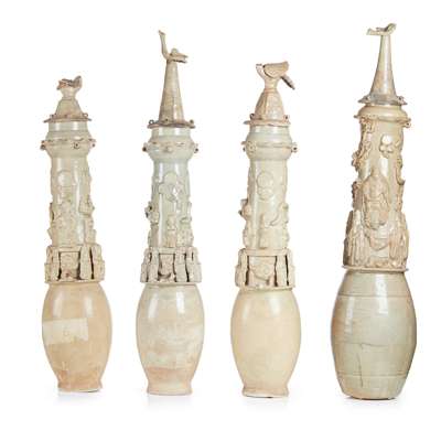 FOUR QINGBAI GLAZED FUNERARY URNS AND LIDS