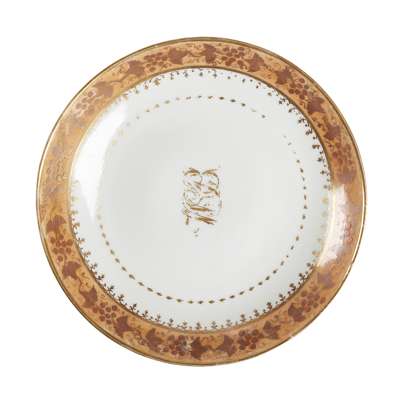 with peach-coloured bands decorated with fruiting vines, enclosing (rubbed) gilt monograms, comprising a covered tea pot, 14.5cm high; a covered coffee pot, 25cm high; a milk jug, 14cm high; a covered tea caddy, 14.5cm high; a slop bowl, 13.5 cm diam.; a covered sugar bowl, 13.5cm high; a plate, 20.5cm diam.; two plates, 19.5cm diam.; a large saucer dish, 15.5cm diam.; 13 tea bowls, 9cm diam.; 11 coffee cups, 6.5cm high; and 13 saucers, 14cm diam. (47)