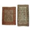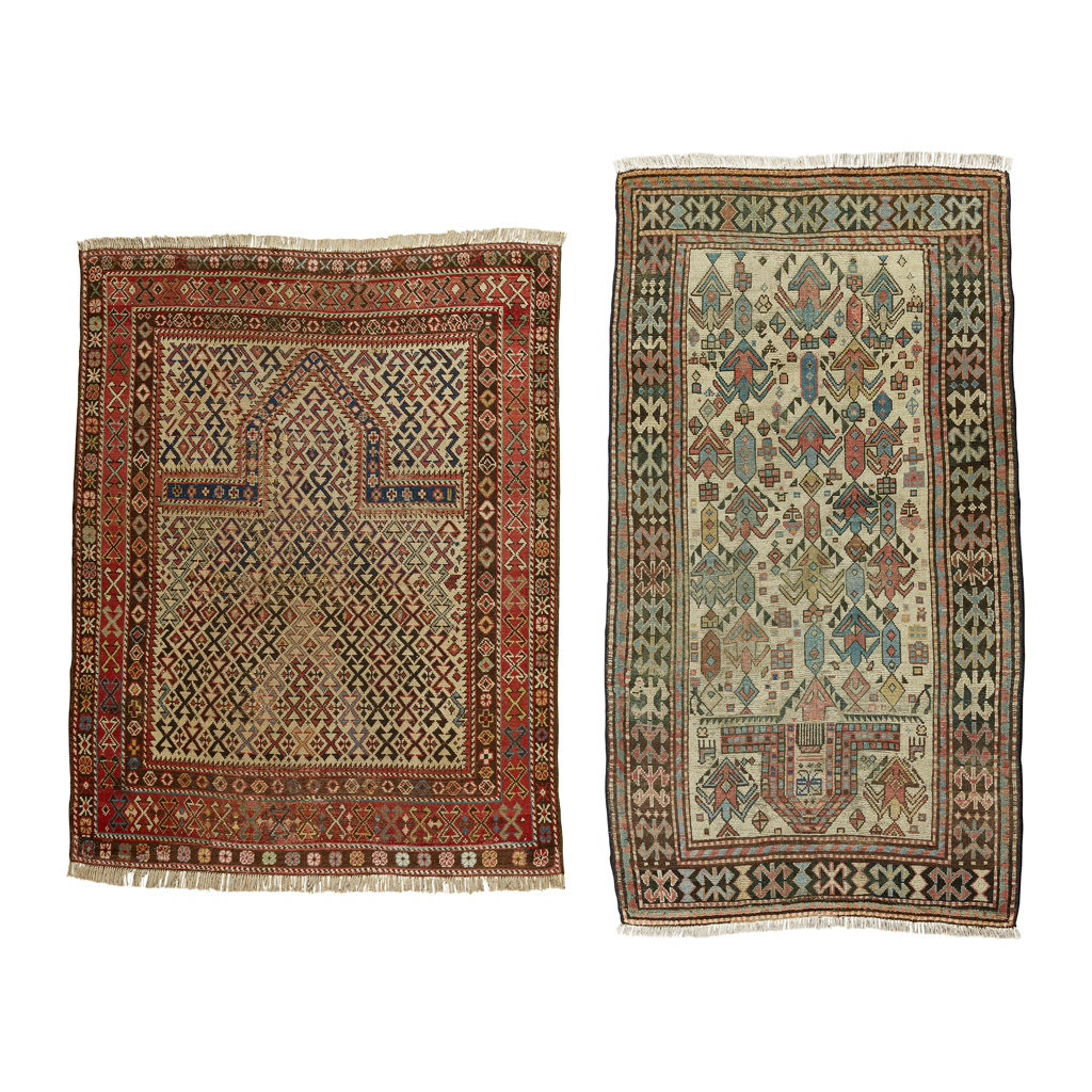 the first with ivory field with allover hooked X pattern, indigo mihrab bar, within narrow red hooked border; the second with ivory field with allover geometric pattern, polychrome mihrab bar, within brown hooked X border (2)