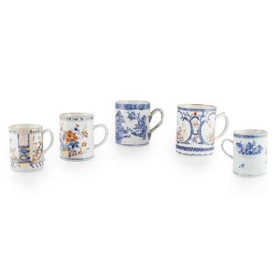 FIVE CHINESE EXPORT PORCELAIN TANKARDS