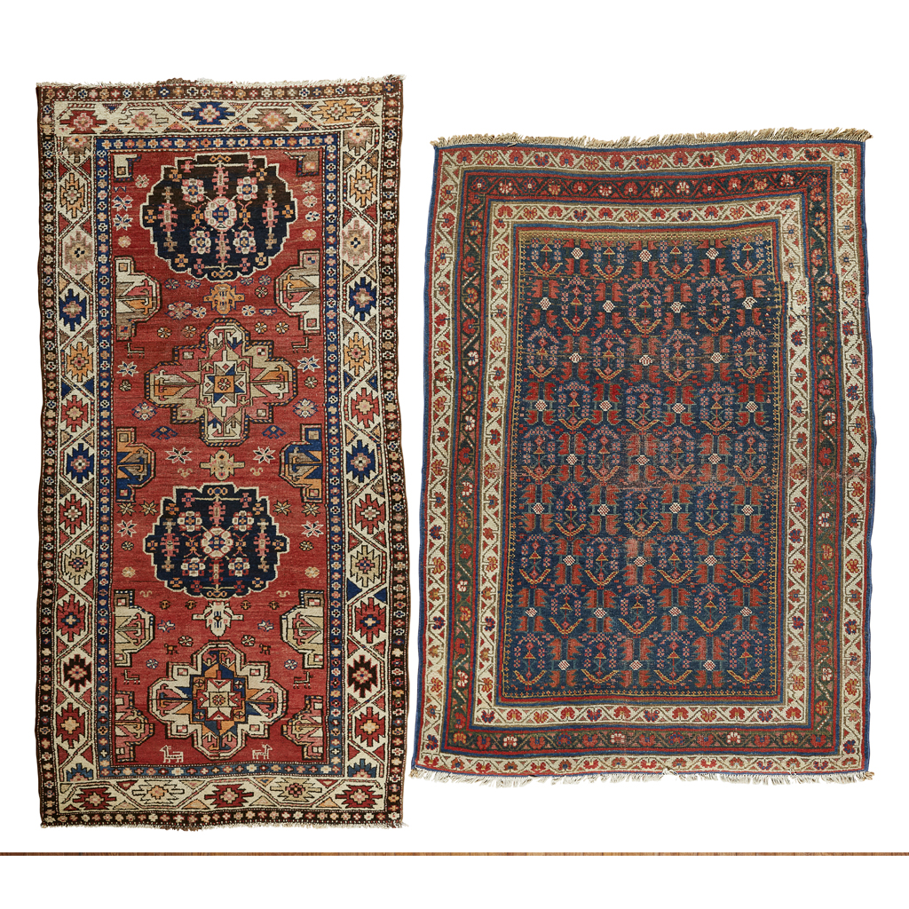 the first with red field with four medallions, within ivory serrated lozenge and vine border; the second the indigo field with allover foliate pattern, within triple borders (2)