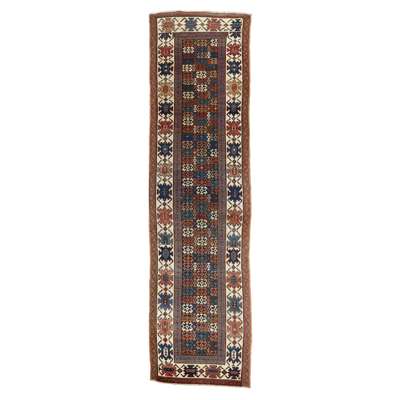 the brown field with allover hooked small lozenge pattern, within ivory stylised harshang border