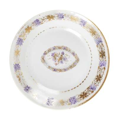 decorated with bands and oval reserves of fruiting vines, in purple and gold enamels, comprising 10 tea bowls, 5cm high; and 10 saucers, 13cm diam. (20)