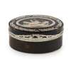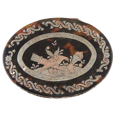 of oval form, the hinged lid inlaid with mixed metals depicting an eagle, quiver of arrows and flaming torch, within a border of alternating scrolls, opening to a void interior