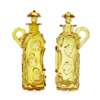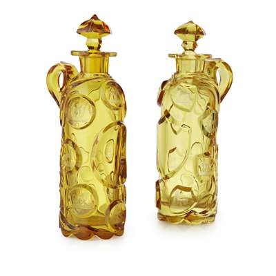 in amber stained/coloured glass, with domed hexagonal stoppers above shouldered cylindrical bodies, with single handles, wheel-engraved with race horses on raised circular or shield-form panels (2)