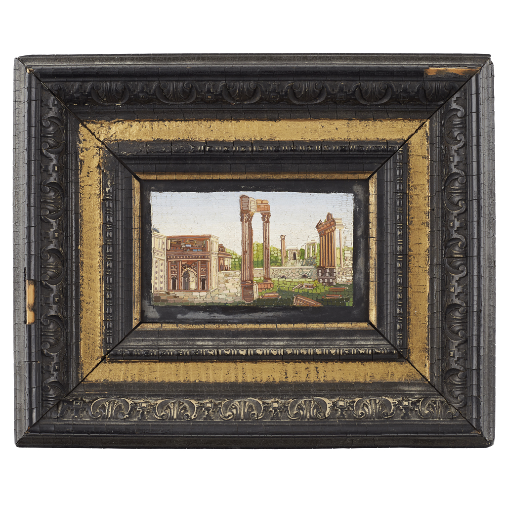 of rectangular form, depicting the Roman Forum, in a carved ebonised and gilt frame