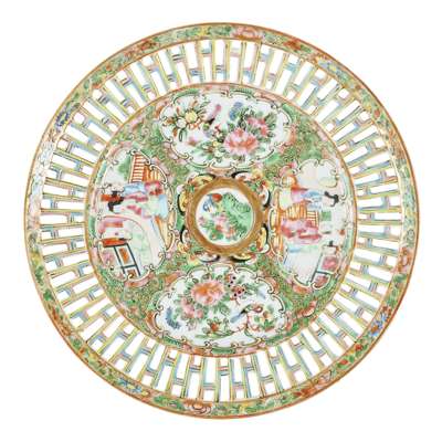 typically decorated with panels of figures, flowers, insects and birds within floral borders, with gilt highlights, some of the later pieces marked CHINA, comprising 15 plates, 24.5cm diam.; 14 soup plates, 21cm diam.; 42 plates, 21.5cm-20cm diam.; 15 lattice-rimmed plates, 21.5cm diam.; four lattice-rimmed plates, 18.5cm diam.; 21 octagonal plates, 19.5-14.5cm diam.; nine saucer dishes, 11cm diam.; three covered soup tureens and platters, of various sizes, largest 27cm high, smallest 23cm high; four covered sauce tureens and platters, tureens 16cm high, platters 20cm wide; pair of rectangular covered vegetable bowls, 24cm wide, 14cm high; a large round covered rice bowl, 25.5cm diam., 15cm high; an oval covered vegetable bowl and platter, bowl, 27.5cm wide, platter 32cm wide; a water pitcher, 17cm high; a sauce boat, 10cm high; three oval platters, 28cm, 27cm and 26.5cm long; a deep oval platter, 25cm long; a further platter, 25.5cm wide; a lobed dish, 24cm wide; nine rice spoons, 12cm long approx; a covered tea pot, 15.5cm high; a covered sugar bowl, 14cm high; two milk jugs, 13cm and 9.5cm high; eight tea cups and eight saucers; five ebb rum tea cups and five saucers; four other tea cups and 22 saucers (qty)