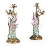 in famille rose enamels, framed on gilt metal mounts with leaves and flower petals forming candle holders, raised on rocky-like circular bases (2)