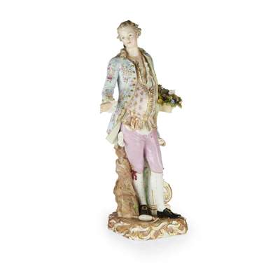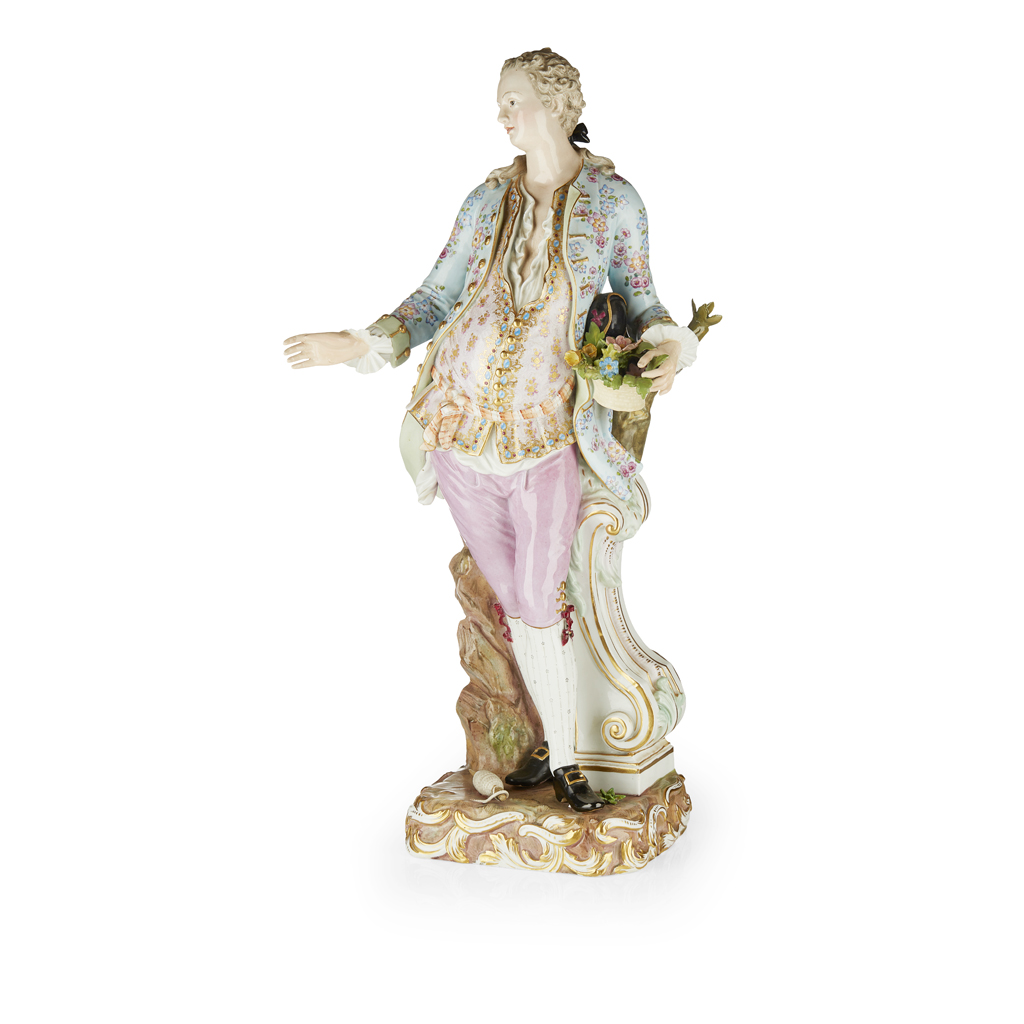 with a floral jacket and gilded waistcoat above pink breeches, with a hat tucked under one arm and a basket of flowers, leaning against a scrolled spandrel on a naturalistic-style base with a spindle at his feet, with blue crossed swords marks, impressed NO 2868/ 93, painted 21.