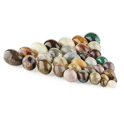 of varying sizes, comprising thirty-three examples, including malachite, onyx, rock crystal, Blue John and Tiger's eye eggs; together with a WOODEN EGG; and a BRASS INSET EGG, comprised of a lid and base, inset with carnelians (35)