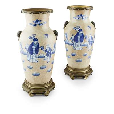 with gilt bronze mounts on cylindrical necks and shouldered bodies, with faux loop handles, raised on gilt bronze bases imitating hardwood stands, decorated in blue and white with scholars, boys and butterflies in a rocky landscape setting (2)