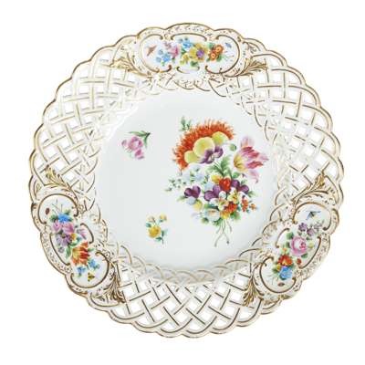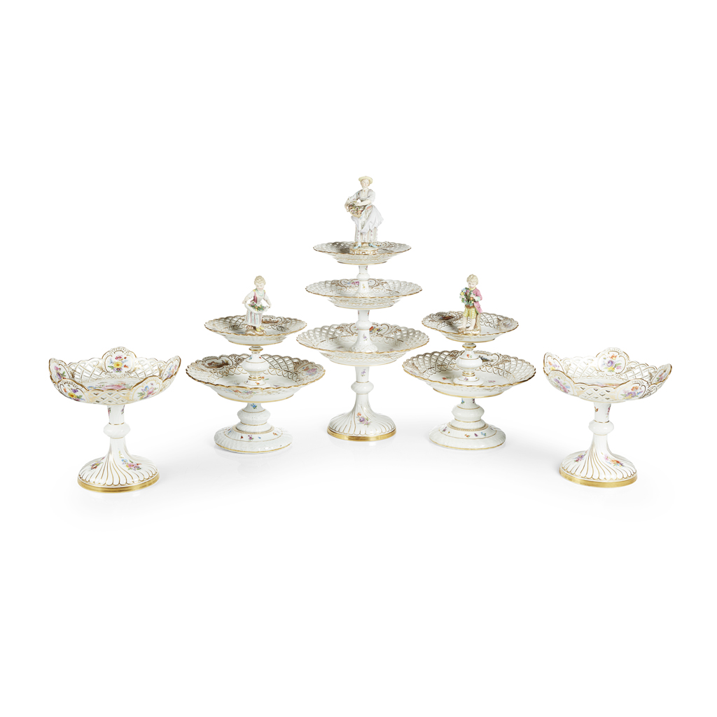 painted with flower sprays within pierced lattice rim-borders with floral reserves and gilt highlights, with blue crossed swords marks, some painted and incised marks, comprising a three-tiered stand, surmounted by a figure of a lady with a basket of flowers, 53cm high; two two-tier stands, each surmounted by figures and decorated with reserves of woodland animals, birds and flowers, 35cm and 34.5cm high; a pair of basket-form comports, 22cm high; 14 plates, 21cm diam.; and nine plates, 23.5cm diam. (28)