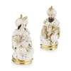 for warming water, modelled as a seated sultan with a pipe and a sultana with a fan and bird, composed of two sections with turban-form stoppers and spouts, in white and gilt enamels, incised numbers to undersides (2)
