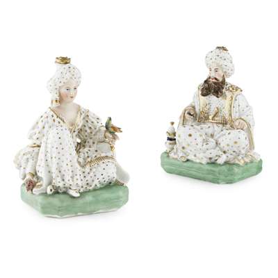 modelled as a seated sultan with a hookah pipe and sultana with a bird, with matched stoppers to the openings in their turbans, in white and gilt costumes on green canted bases, with maker's marks (2)