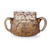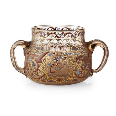 of squat lobed form with twin handles, depicting Persian-styled horse riders within foliage and strapwork, decorated in red, blue and green enamels with gilt work, signed E. GALLÉ À NANCY.
