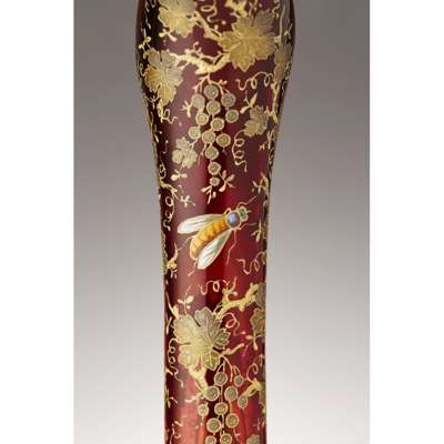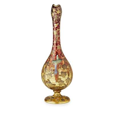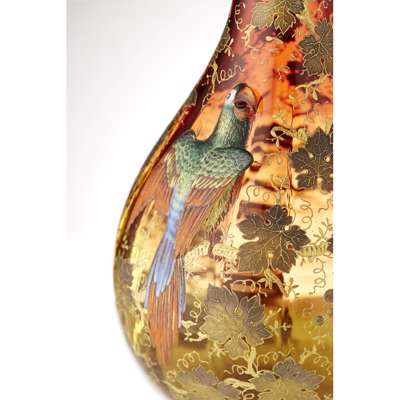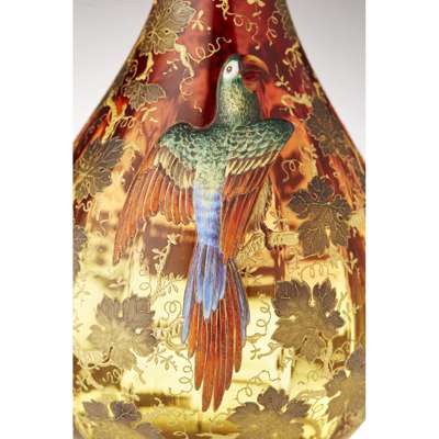of baluster form, the slightly lobed body graduated from red to yellow with a relief enamelled metal parrot, against a ground filled with enamel vine leaves and insects, gilt marks to the base 2789.