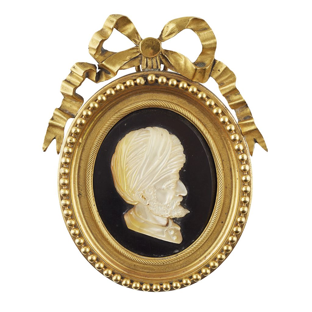 carved in high relief, depicted in profile with a turban and set on a black slate ground, within an oval gilt bronze beaded frame surmounted by a ribbon bow