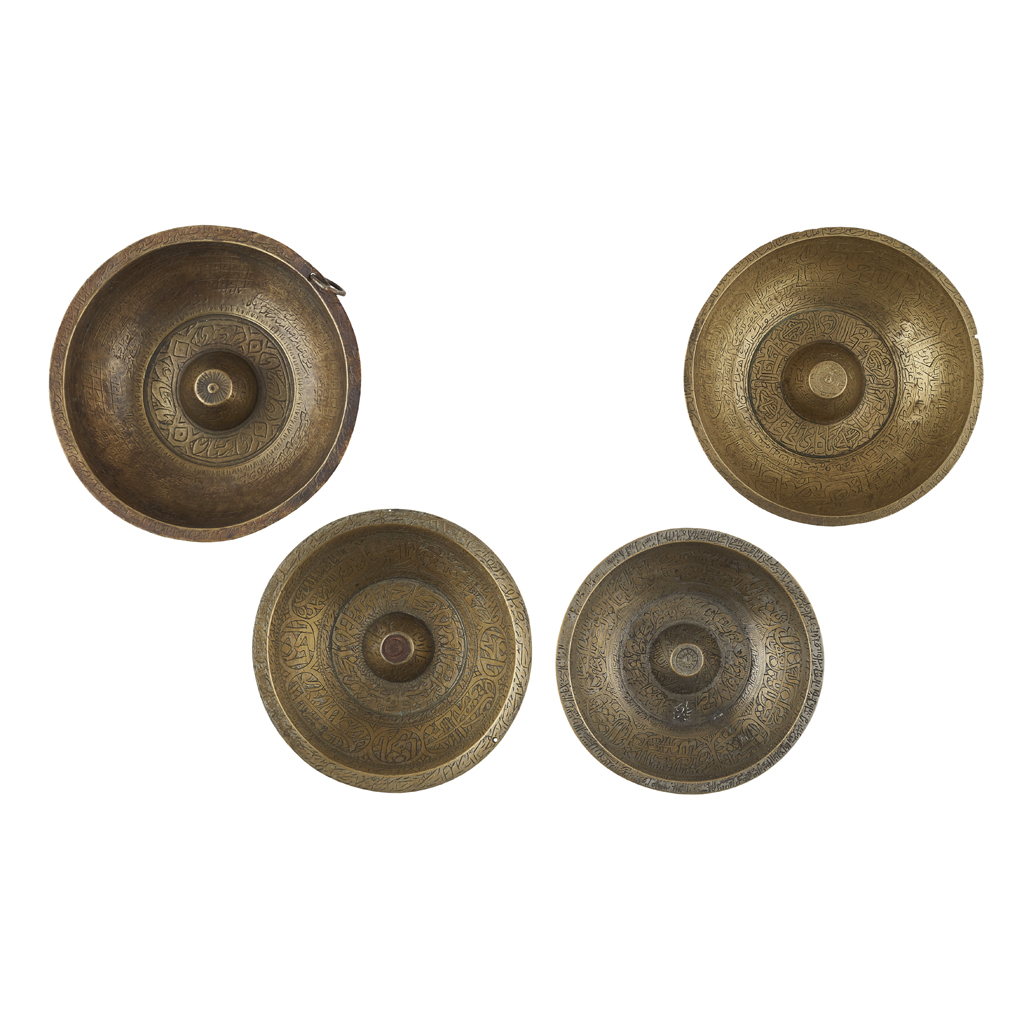 with slim-flattened rims, the shallow wells with raised centres for placing the index finger, engraved with calligraphic script to interiors and exteriors (4)