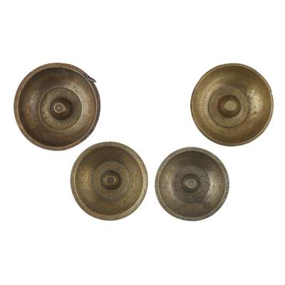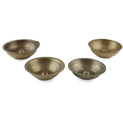 FOUR INDIAN ENGRAVED BRASS BEGGING BOWLS