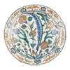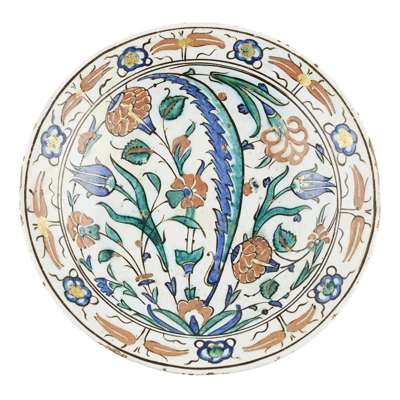 with a flattened rim and shallow well, decorated in blue, green and red glazes with carnations, tulips and saz leaves, highlighted with gilding