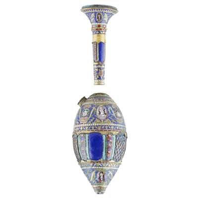 comprising a pear shaped reservoir/base, in polychrome enamels depicting bands of female faces enclosing panels of flowers with gilt highlights, and a top section of flared form, with corresponding decoration (2)
