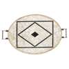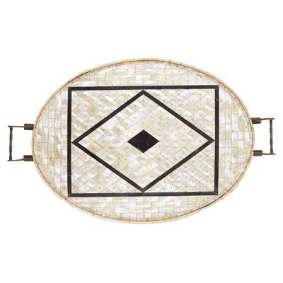 of oval form, veneered in pinned mother-of-pearl and tortoiseshell panels on a hardwood base, mounted with brass handles