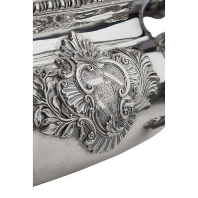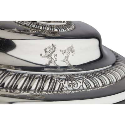 Note: The armorial bearings as engraved upon this George III English soup tureen are those of the family of Ormsby-Gore with Ormsby in pretence. These armorial bearings denote the marshalling of a marital coat showing the arms of the husband over the entire surface of the shield, whilst the arms of the wife (as an heraldic heiress) are placed on a small