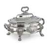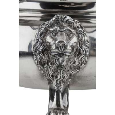 of oval outline and baluster bellied form with cast acanthus handles and foliate supports, the pull off cover of domed form with gadrooned border and shell details, with cast foliate finial, applied armorial to body and crests to cover, raised on four cast paw feet and lion mask supports, together with unmarked liner