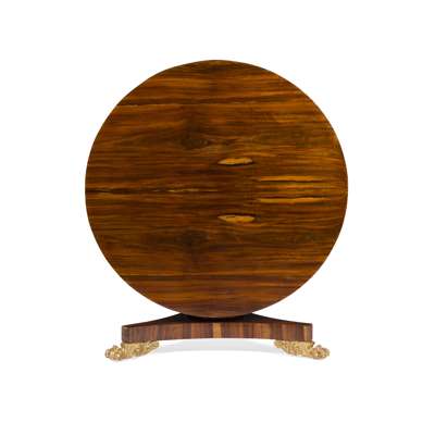the circular tilt top above a plain frieze, on an hexagonal tapered column and triform base, raised on carved giltwood lion paw and scroll feet with brass castors