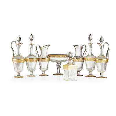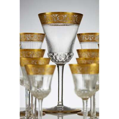 decorated with gilt bands of scrolled flowers above ribbed bodies and cut bowls, raised on slim facet-cut stems and plain feet with various corresponding gilt bands, variously marked, comprising 11 water glasses, 18cm high; 12 red wine glasses, 16cm high; 12 tall white wine glasses, 21cm high; eight port glasses, 14cm high; 18 champagne coupes, 13cm high; 10 champagne flutes, 19cm high; 10 liqueur glasses, 13cm high; six large Commemoration glasses, 26.5cm high; two pitchers, 30cm high; two pitchers with stoppers, 38cm high; two rounded decanters and stoppers, 39cm high; a squared decanter and stopper, 24.5cm high; and two footed fruit bowls, 19.5cm high (qty)