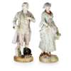 in polychrome enamels and costumes, modelled as a gentleman and lady in 18th century dress, the gentleman with a hat at his feet, standing against a scrolled spandrel, the lady holding a basket of flowers, with blue maker's marks (2)