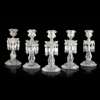 comprising two pairs and a single candlestick, all with beaded and oval-moulded nozzles above lobed drip trays, of slightly varying design, hung with cut-glass prisms and raised on baluster stems, with corresponding domed bases, four with acid-etched maker's marks (5)
