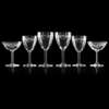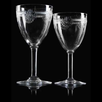 decorated with Greek key bands and anthemion palmettes above olive branch swags, on plain stems and feet, some marked, comprising 24 water glasses, 17cm high; 24 red wine glasses, 15cm high; and 24 champagne coupes, 12cm high (72)