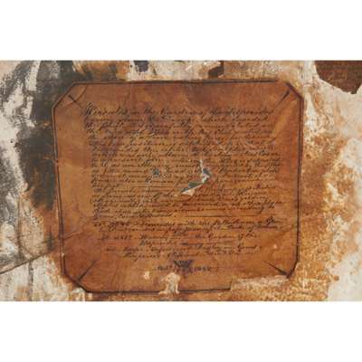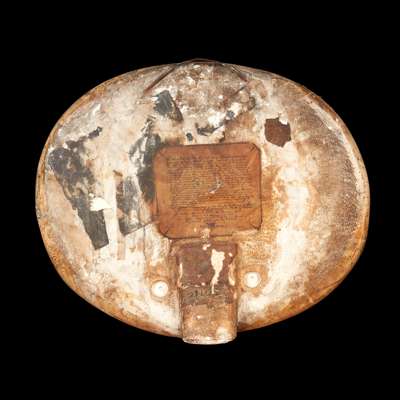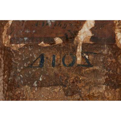 oval, depicting a seated Hercules, identified by the leopard skin upon which he sits, before a standing figure of a nymph of Hesperides, with various old partial exhibition labels to the reverse.