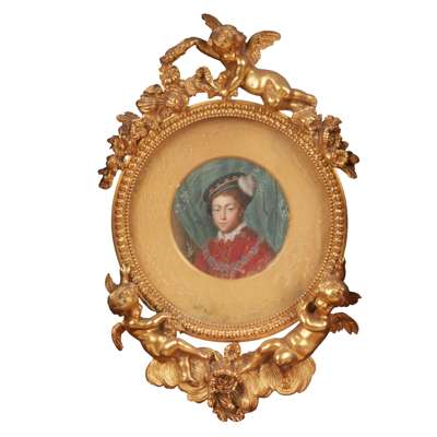 watercolour and body colour on vellum, in gilt metal frame with putti and flower garlands mounted in a box frame with easel support, inscribed on the reverse, Edward 6 King/ of England/ Holbein