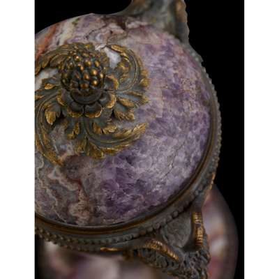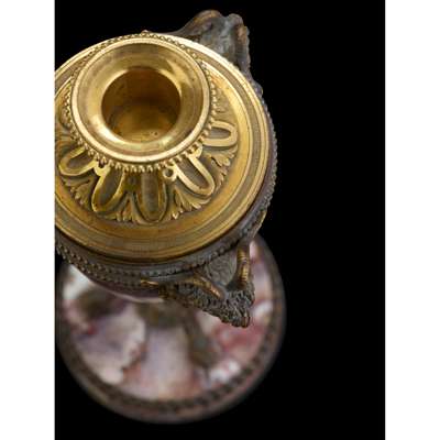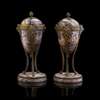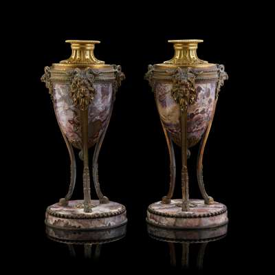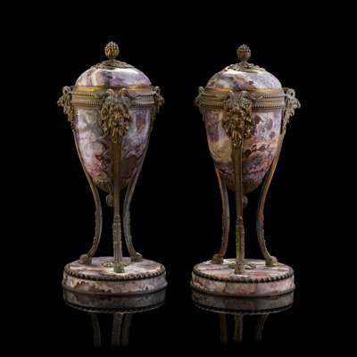 in the form of perfume burners, the tapered ovoid bodies with beaded rims supported on three satyr-mask monopodiae with hoof feet, the reversible domed covers with berry finial and candle nozzles, on circular base centred by a rosette (2)