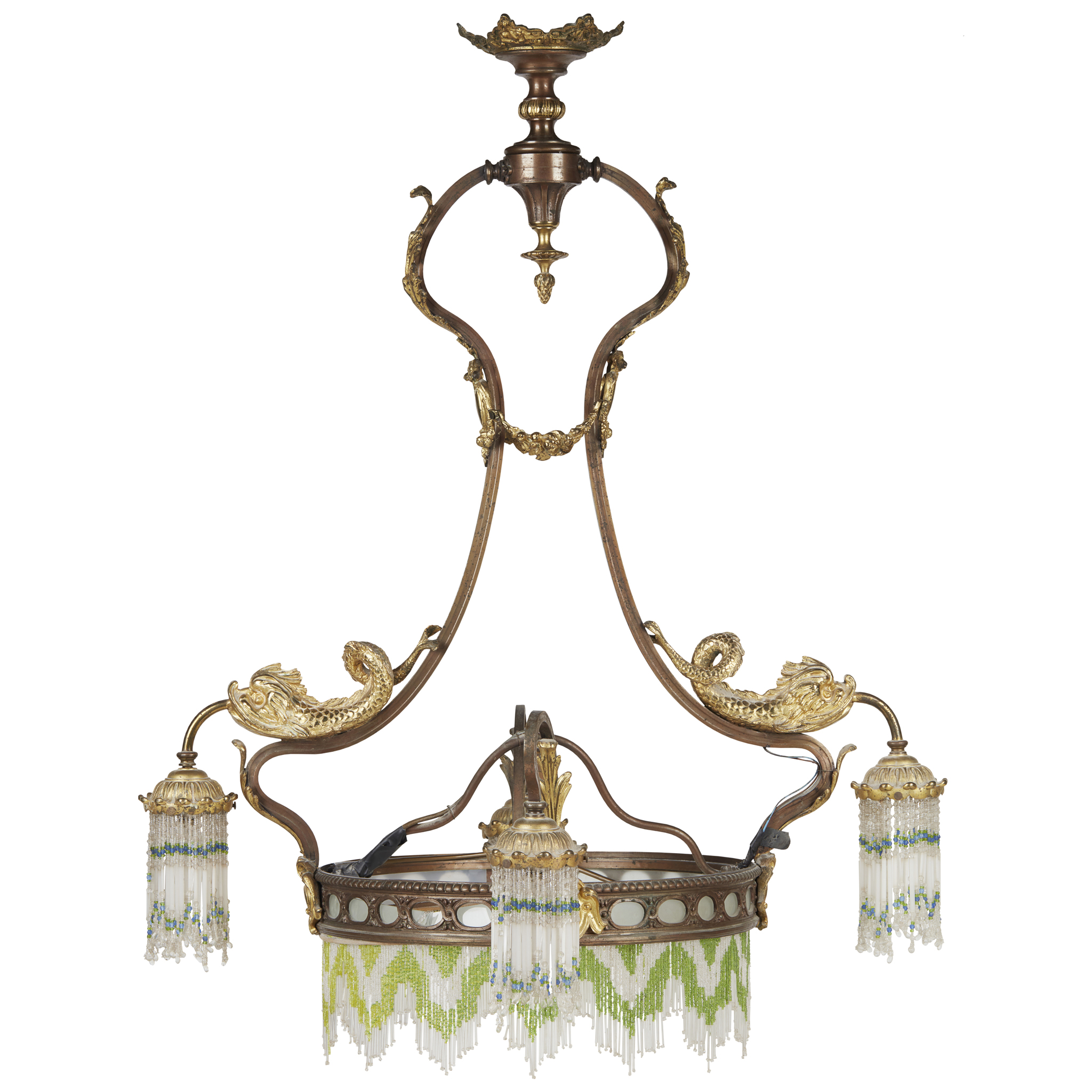 the scrolling bronze frame with gilt bronze dolphins, and four pendant lights above a pierced ring all hunge with green and clear glass bead tassels, wired for electricty