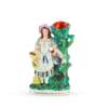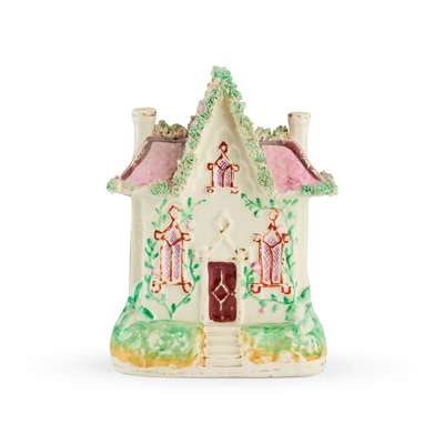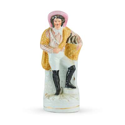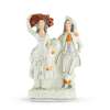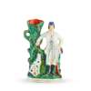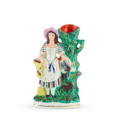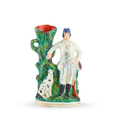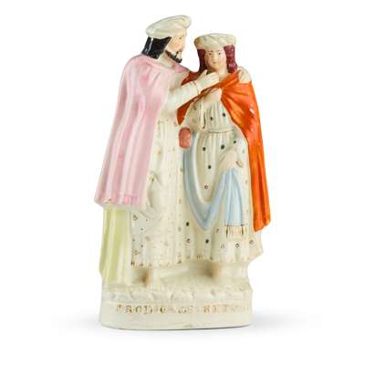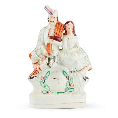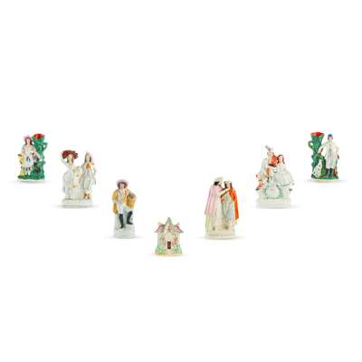 to include a large flatback Highlander couple seated above a clock face, 35.5cm; a flatback group titled ‘PRODIGAL’S RETURN', 35cm; a flatback harvest couple, 32.5cm; a flatback figure of a fishmonger, 33.5cm; a pair of hunter and companion spill vases, 28cm; and a cottage, 22cm (7)