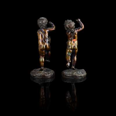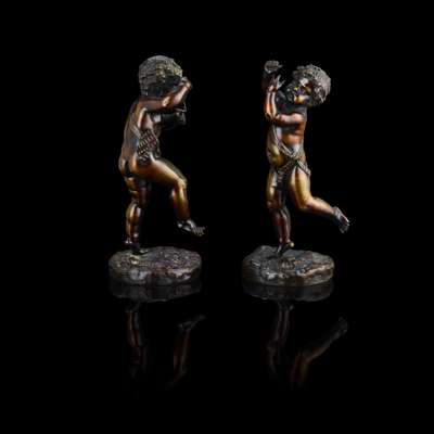 bronze, medium brown patina, to include a putto with a triangle and a putto playing a tambourine (tambourine lacking) on circular bases, unsigned (2)