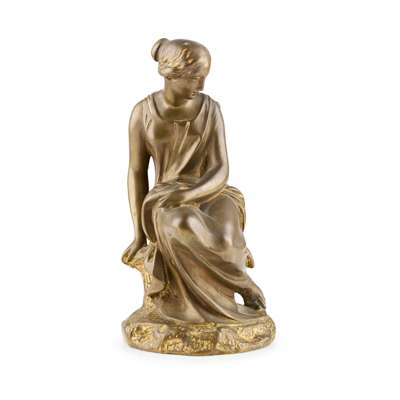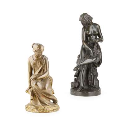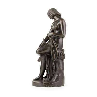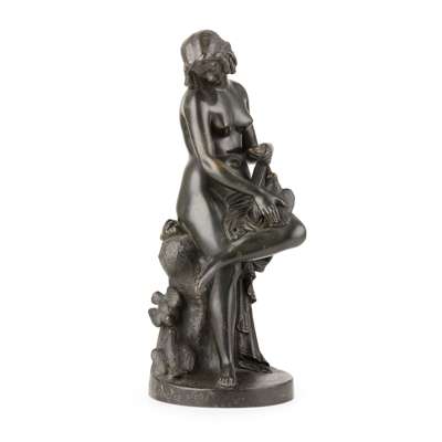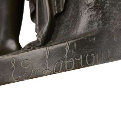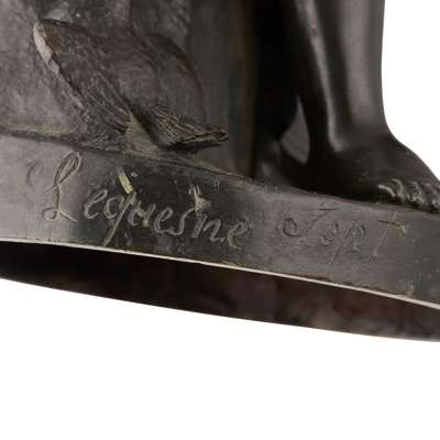bronze, dark brown patina, signed on the oval base Lequesne Scpt, and E deLabroue foundry; together with A FRENCH BRONZE FIGURE OF A YOUNG WOMAN, 19TH CENTURY, green/brown patina with gilding, unsigned, 21cm (2)