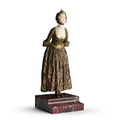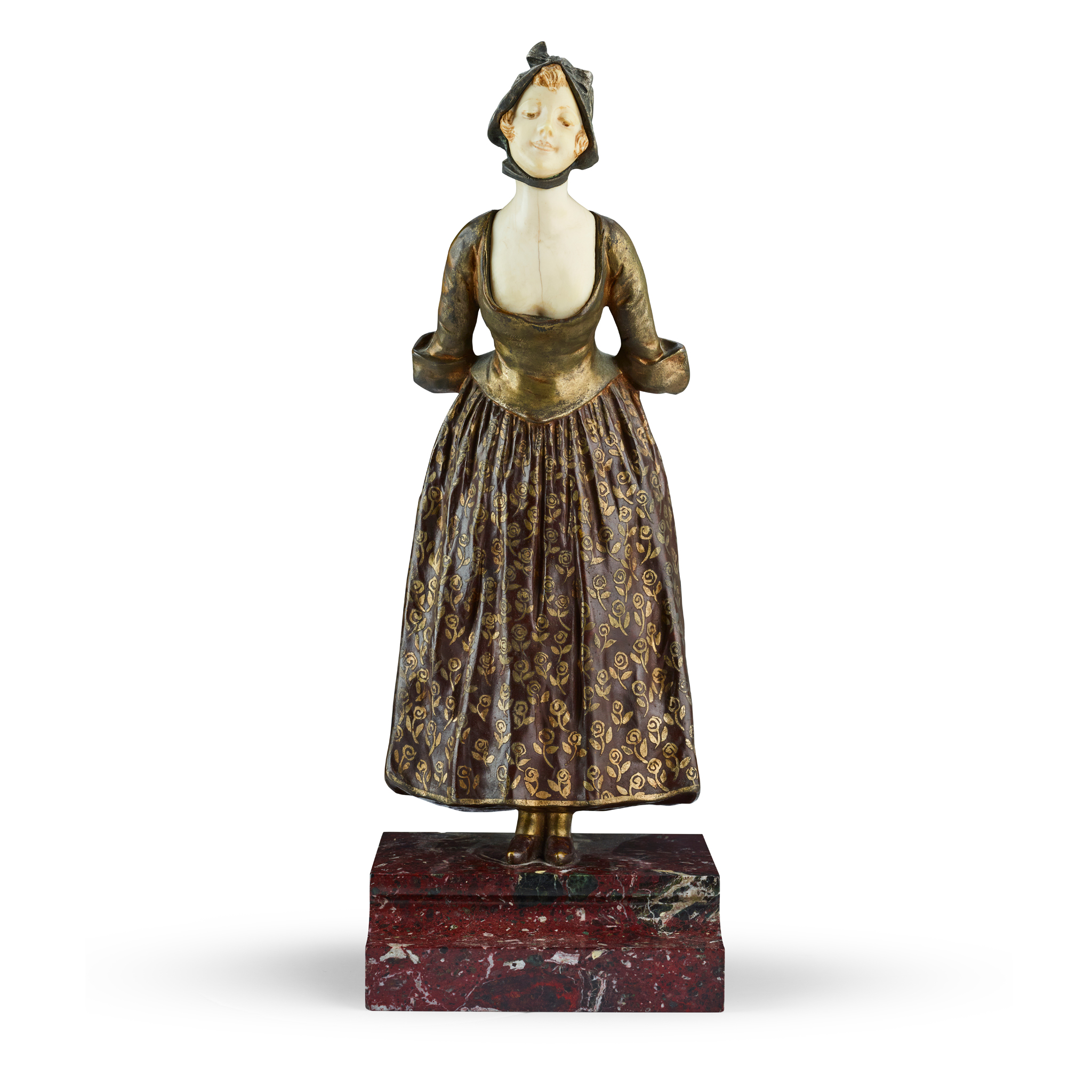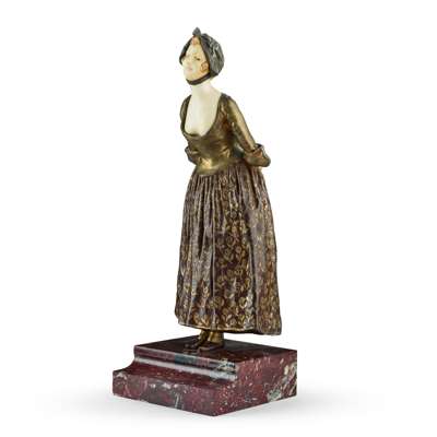 patinated bronze and carved ivory, the figure modelled leaning forward with her hands clasped behind her back, signed ‘Van der Straeten’, on a rouge marble base