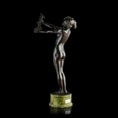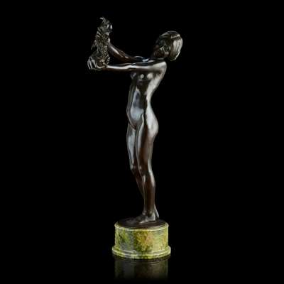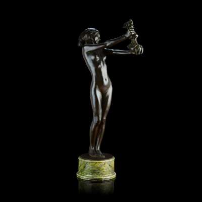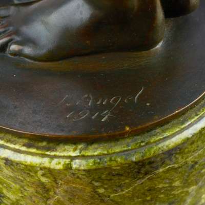 bronze, dark brown patina, signed J. Angel 1914 on the base, mounted on a Swedish green marble cylindrical plinth
