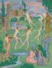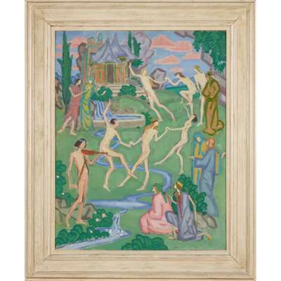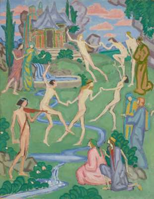 This painting is steeped in Bloomsbury influences. There’s a certain Medievalism in its composition, like an illumination in a manuscript, that recalls William Morris, yet a louche sensibility and abstraction in its execution that is pure Post-Impressionism. And it was Fry, after all, who had just brought Modern French painting to London, to shocking effect, in the same year that this work was painted. He may well have known about Matisse’s The Dancers, painted for the Russian collector Sergei Schukin in 1909, with its similar circle of Bacchante, but Fry’s work speaks equally to Cezanne’s painting of bathers, or Gauguin’s Tahitian fantasies – albeit seemingly set in garden at Garsington Manor, home of society hostess Lady Ottoline Morrell, where all the bright young things of Bloomsbury would gather at weekend, both to dress up and (later) take off their clothes.