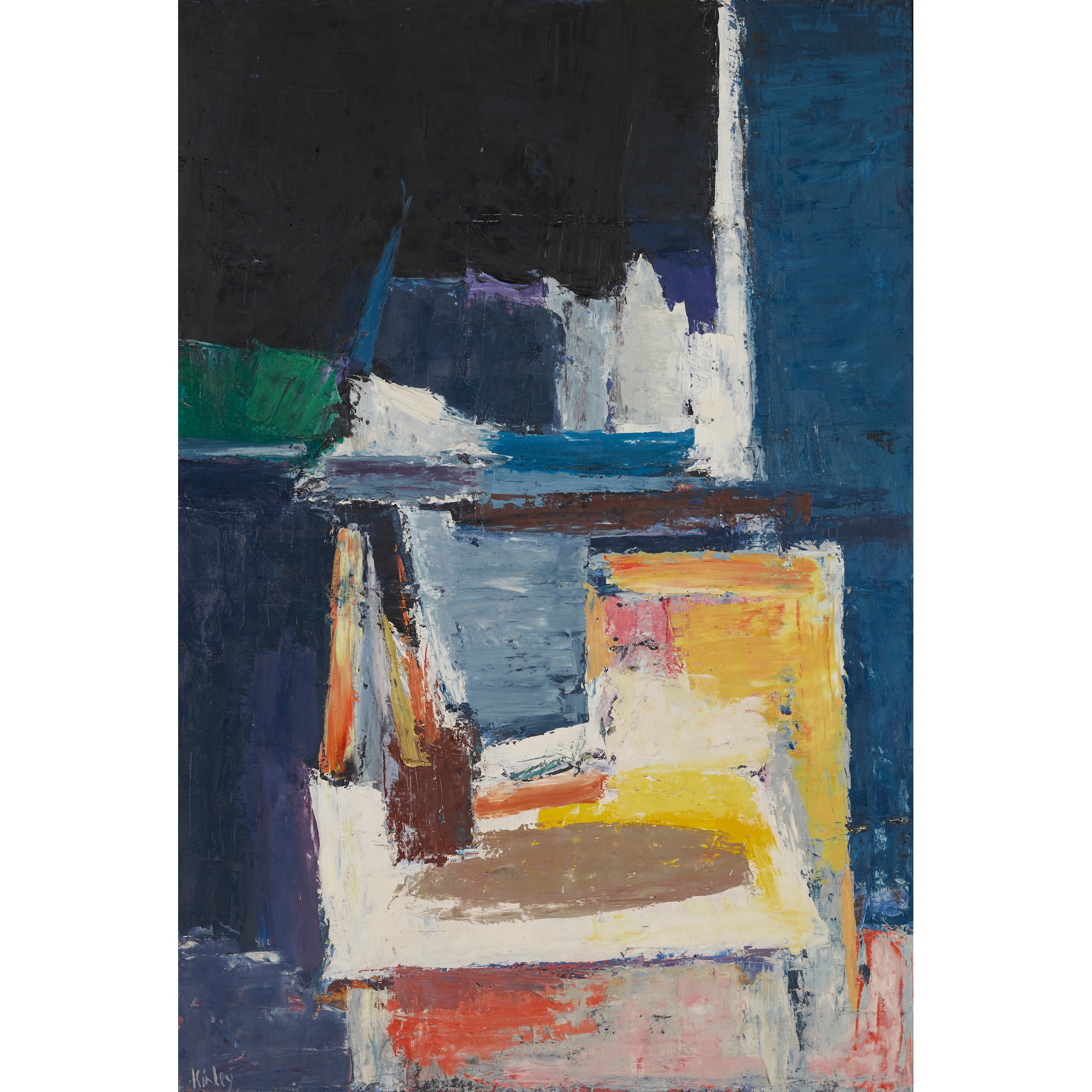 When Studio Interior was painted Kinley’s star was on the rise. Over the course of the 1950s he gradually relinquished thick, gestural, painterly impasto in favour of a sparer and more clarified aesthetic quality. In 1951 and ‘53 Kinley was selected for Gimpel Fils’ Six Young Contemporaries exhibition, and his first solo exhibition was held at the same gallery in 1954. Solo exhibitions of Kinley’s work were held at Paul Rosenberg & Co in New York in 1960 and 1962. A further studio interior scene, also from 1960 and similarly composed of blocks of impastoed colour, is in the collection of Bristol Museum & Art Gallery (K5556)